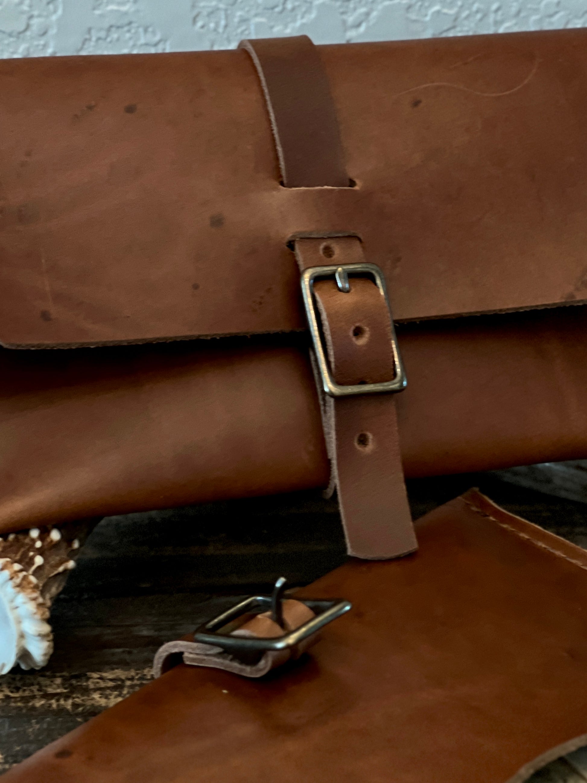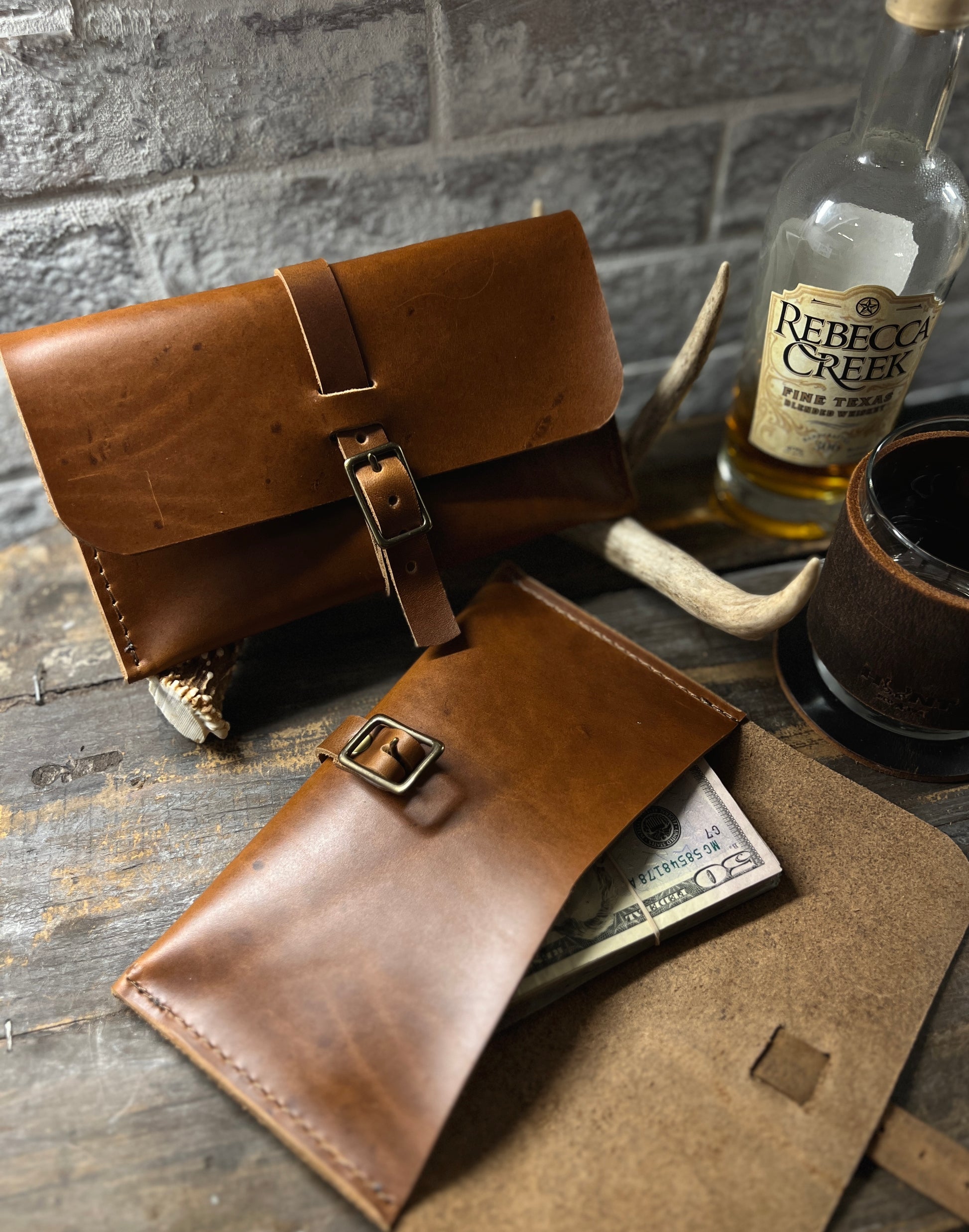 Bankers Wallet is a Large single pocket wallet for those needing a little extra room for carrying fat stacks. Handmade from our premium Oxford Xcel leather with a single antique brass center bar buckle. Measures 8" wide by 4.5" tall.