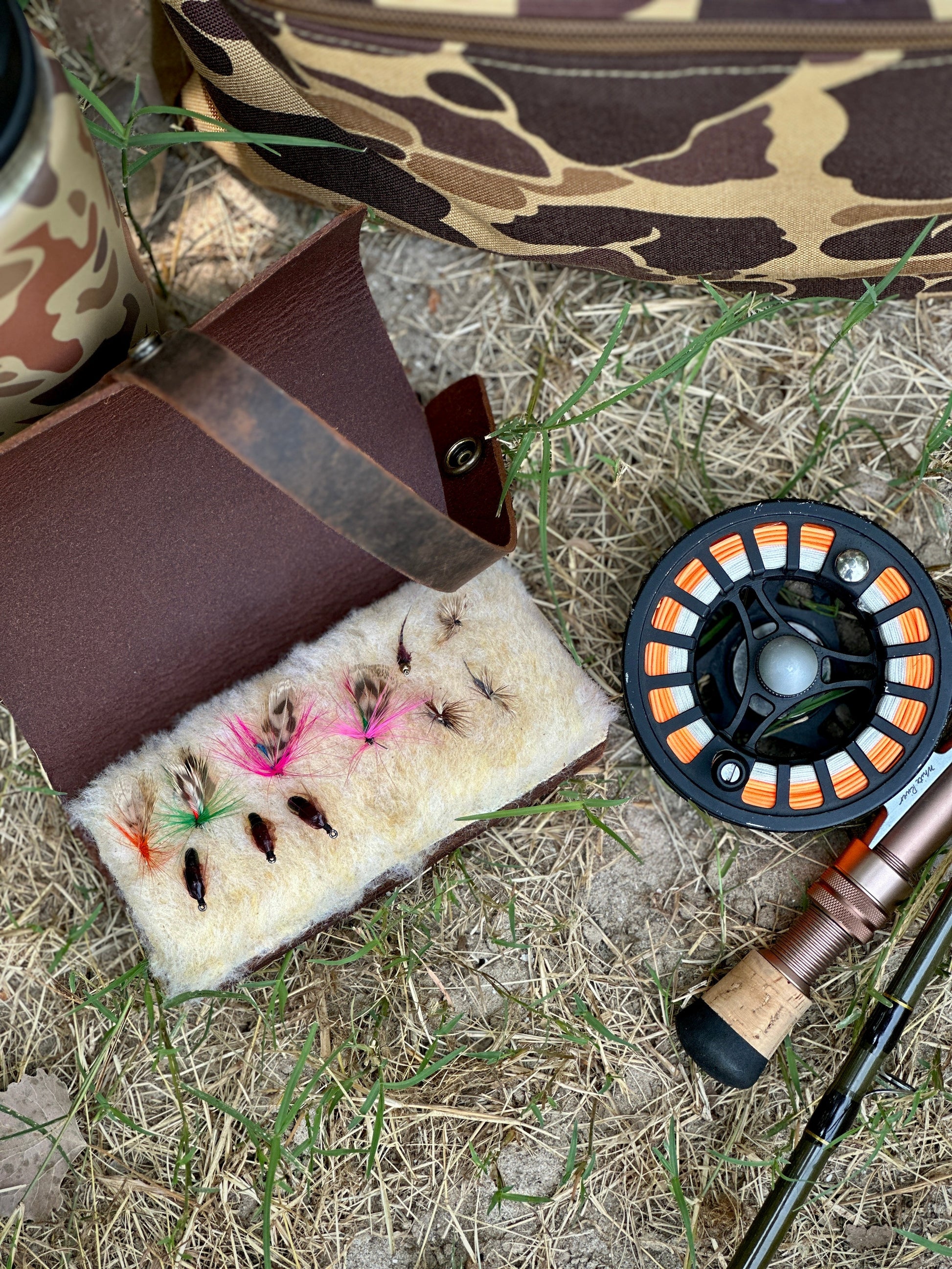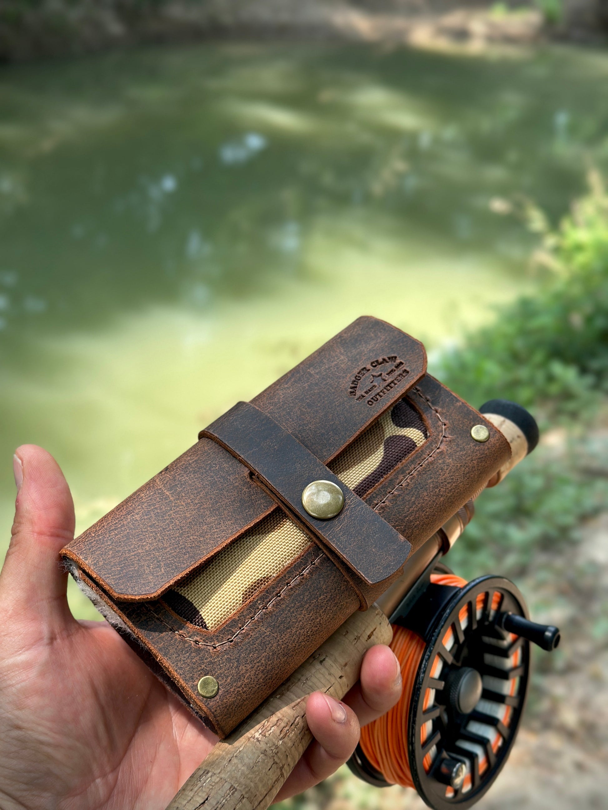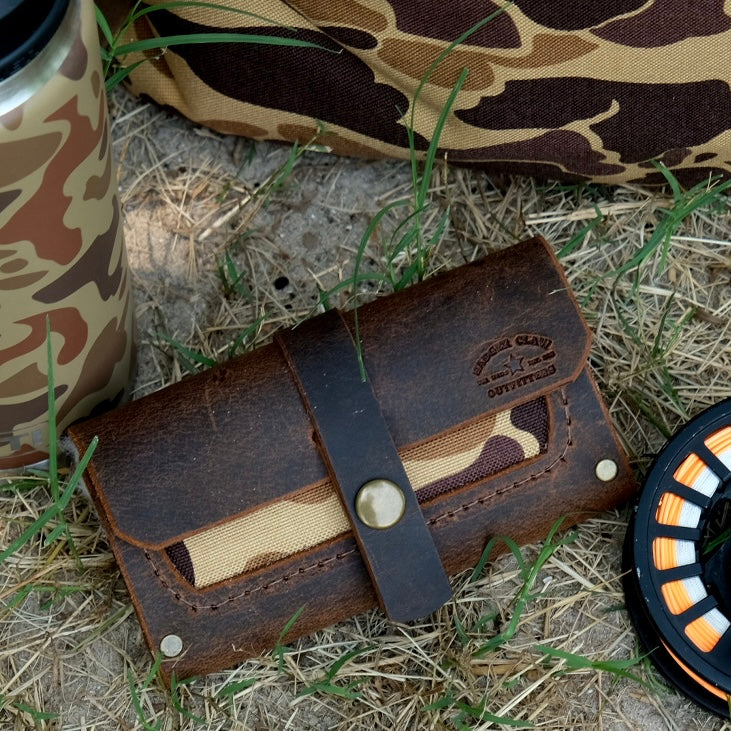 Fly Wallet, 7oz crazy horse leather wrap with 1000D nylon duck camo inlay. Wool fly patch to keep your tackle secure. Solid brass snap.