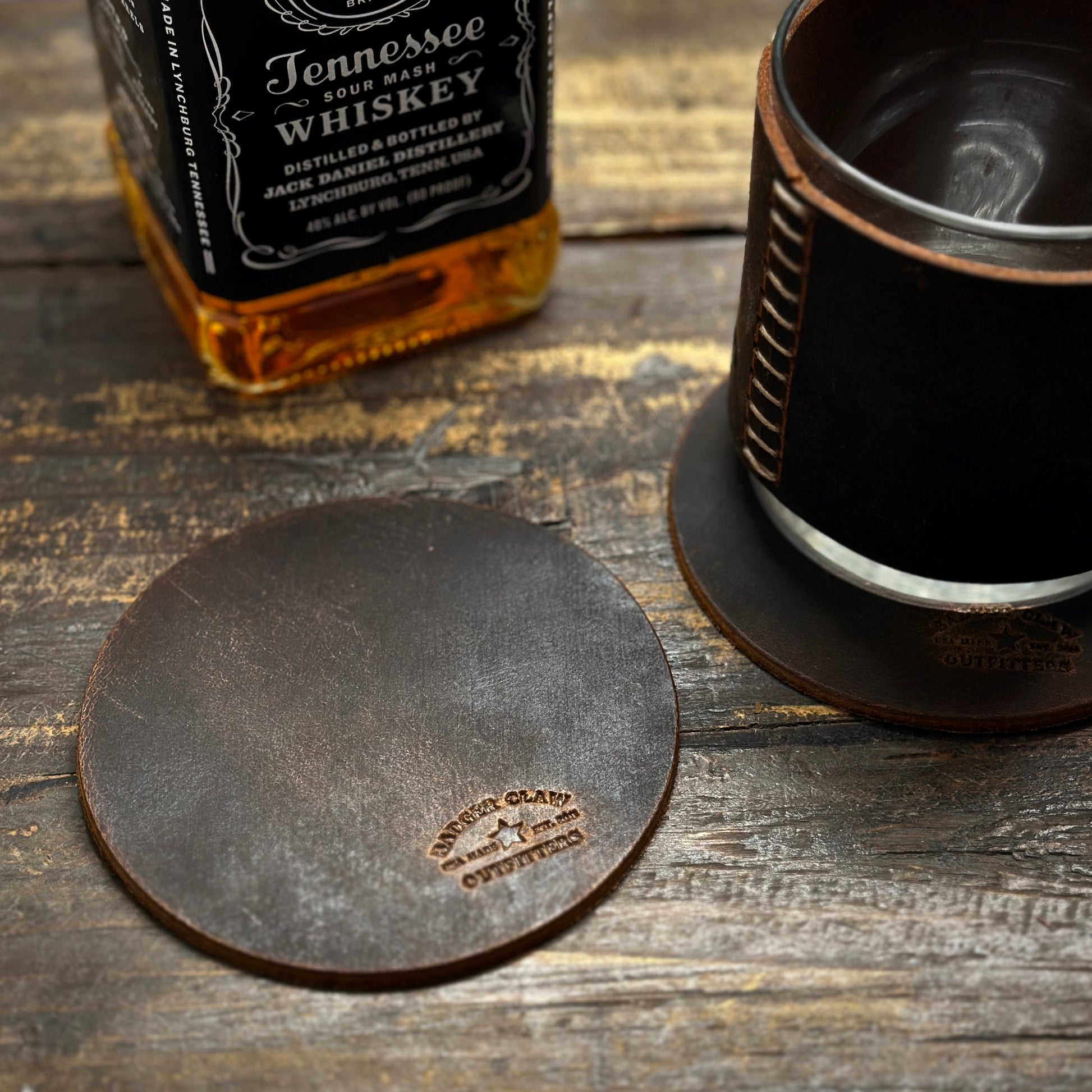 We use our heavy 10oz leathers with burnished and waxed edges to make these classy coasters. Each Leather Drink Coaster Set includes 4 coasters.